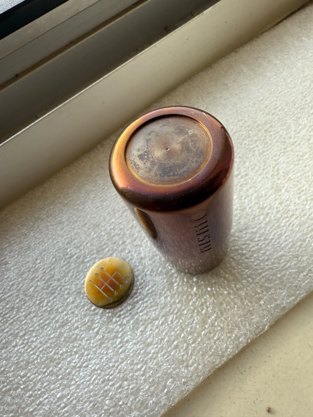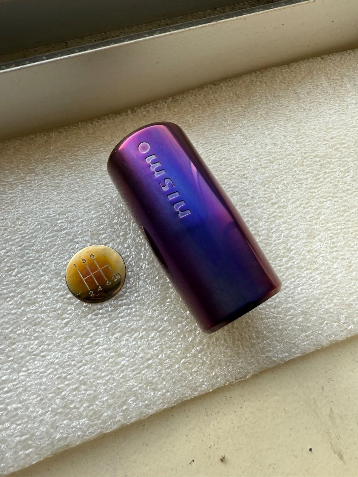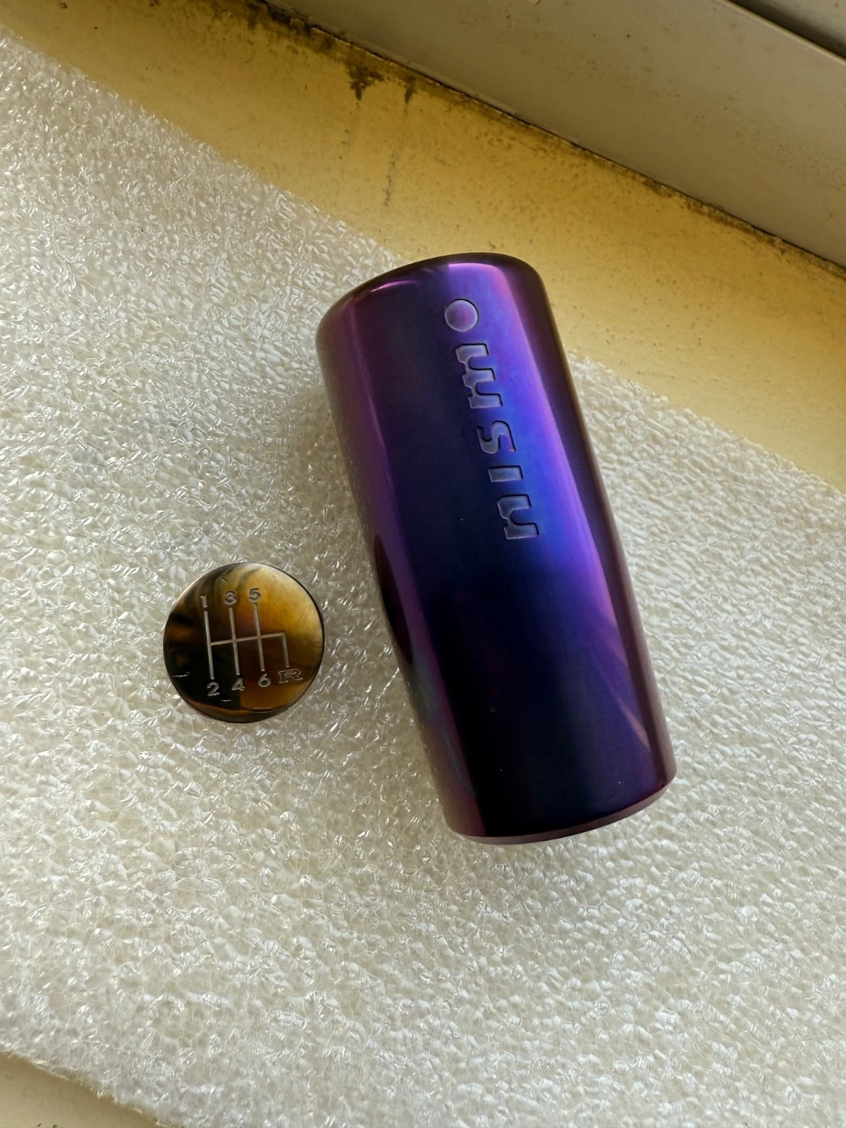 Rare mid logo burnt ti shift for R34/S15/Z34. Plastic shift incert bas been changed to titanium one. Medallion can be applied after install for correct orientation